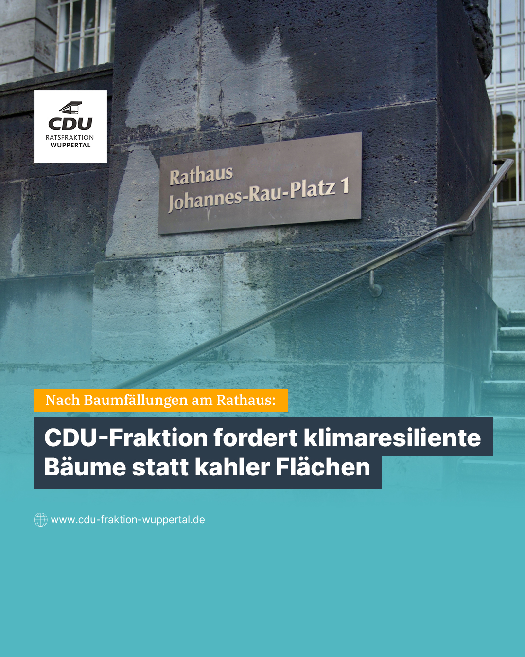 mehrNach der Entscheidung, die Linden am Rathaus zu entfernen, fordert die CDU-Fraktion eine verbindliche und nachhaltige Nachpflanzung. Ziel ist eine Begrünung mit klimaresilienten Baumarten, die Hitze, Trockenheit und verdichtete Böden langfristig aushalten. Sowohl der Rathausvorplatz als auch der Innenhof sollen dabei einbezogen werden. Die CDU betont, dass nur standortgerechte und robuste Bäume dem Stadtbild und dem Stadtklima dauerhaft helfen. #cdu #cdufraktion #cdufraktionwuppertal #wuppertal #politik #partei #ratsfraktion #rathausplatz