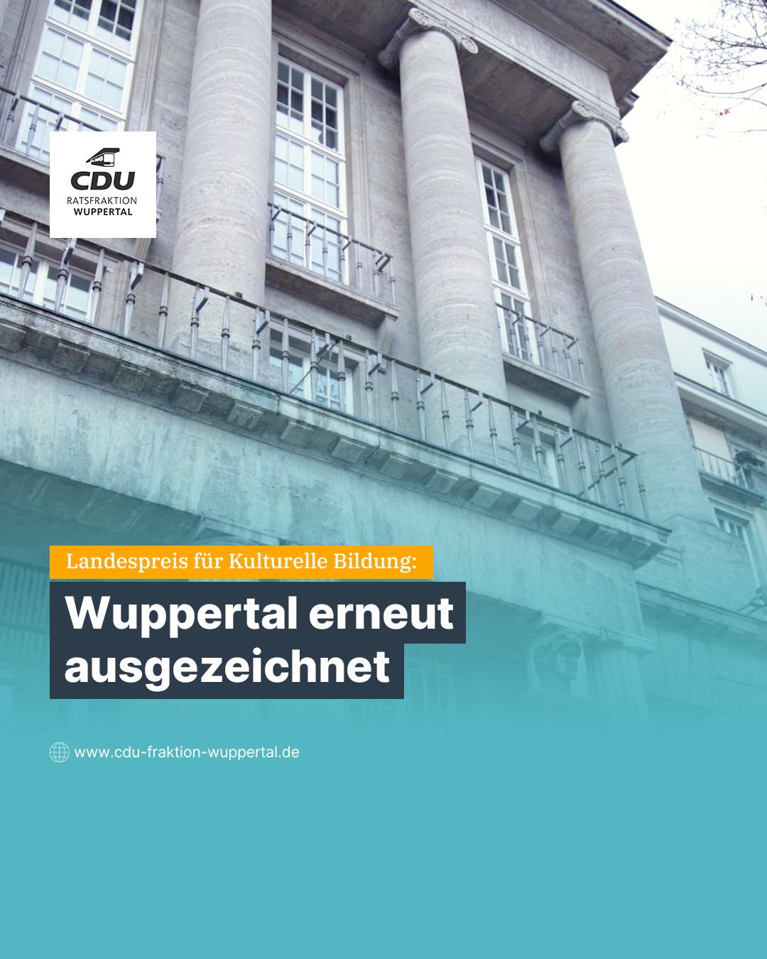 mehrDie Stadt Wuppertal erhält nach 2022 erneut den NRW-Landespreis für Kulturelle Bildung. Ausgezeichnet wurde insbesondere die landesweit einmalige enge Zusammenarbeit zwischen Stadtverwaltung und Freier Szene. Der mit 15.000 Euro dotierte Förderbescheid wurde im Rathaus in Barmen übergeben. Die Stadt überzeugt mit nachhaltigen Strukturen, die Kindern und Jugendlichen früh und dauerhaft den Zugang zu Kunst und Kultur ermöglichen. #cdu #cdufraktion #cdufraktionwuppertal #wuppertal #politik #partei #ratsfraktion #landespreis