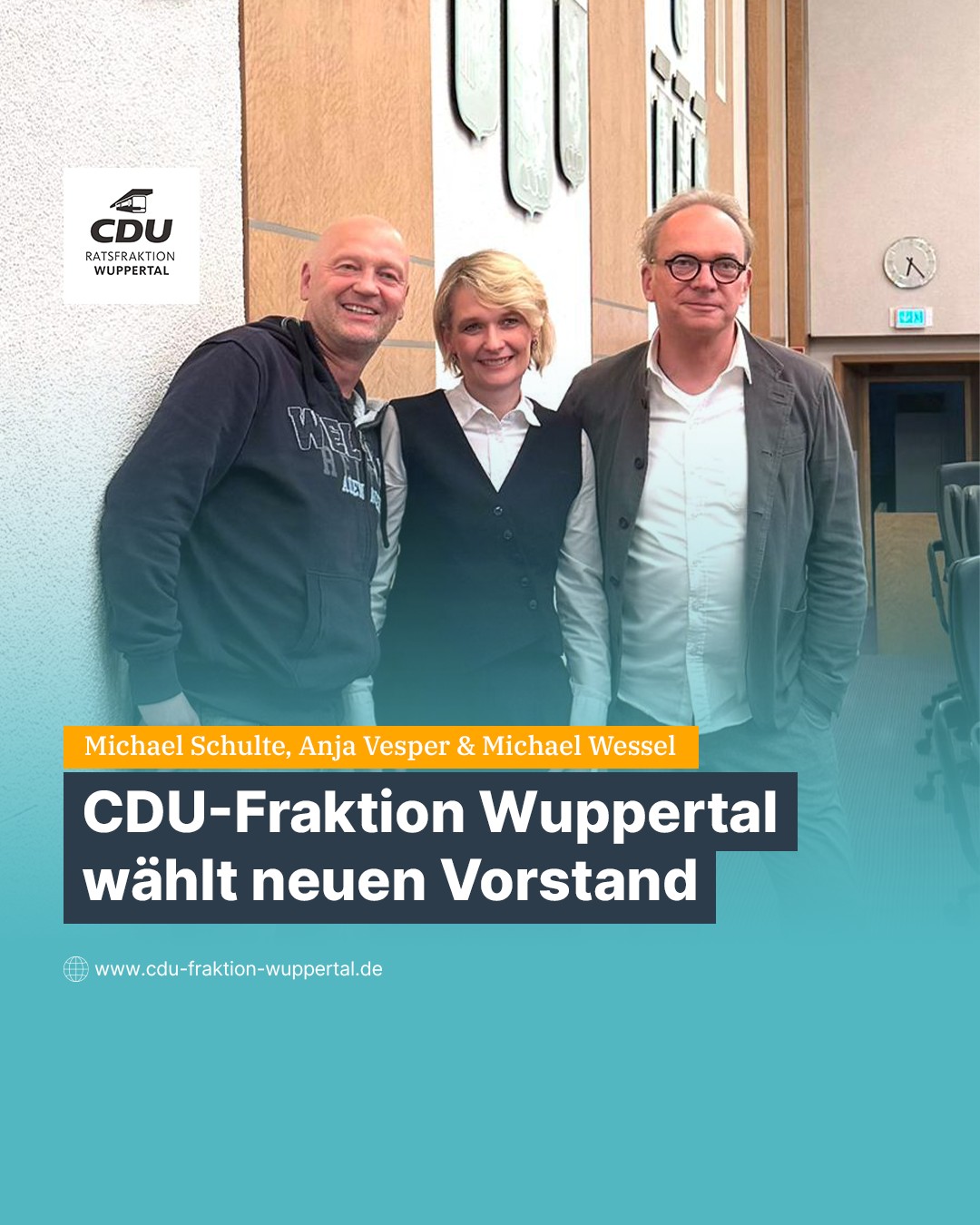 mehrDie CDU-Fraktion im Rat der Stadt Wuppertal hat ihren Vorstand neu gewählt und setzt weiter auf eine Doppelspitze: Michael Wessel wurde im Amt bestätigt, neu an seine Seite rückt Anja Vesper. Unterstützt wird das Führungsduo von Michael Schulte, der zum stellvertretenden Vorsitzenden gewählt wurde. Zum erweiterten Vorstand gehören Gregor Ahlmann, Thomas Hahnel-Müller, Barbara Becker, Heinrich Bieringer und Alexej Hundt. Außerdem nominierte die Fraktion Rainer Spiecker mit breiter Unterstützung für das Amt des Bürgermeisters. Inhaltlich will sich die CDU künftig stärker auf Stadtentwicklung, wirtschaftliche Zukunft, Bildung und Sicherheit konzentrieren. #cdu #cdufraktion #cdufraktionwuppertal #wuppertal #politik #partei #ratsfraktion #vorstand #fraktionsvorsitzende