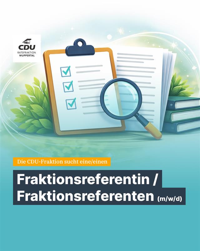 mehrDie CDU-Fraktion im Rat der Stadt Wuppertal sucht zum nächstmöglichen Zeitpunkt eine/n motivierte/n Fraktionreferentin / Fraktionsreferenten (m/w/d) in Teilzeit (30 Std). Sie möchten die ehrenamtliche Arbeit unserer Ratsmitglieder aktiv unterstützen? Dann erwarten Sie vielseitige Aufgaben ? von der inhaltlichen Vorbereitung politischer Initiativen über die Begleitung von Sitzungen bis hin zur Presse- und Öffentlichkeitsarbeit, insbesondere im Bereich Social Media. 👉 Alle Infos zur Stelle und zu den Anforderungen finden Sie auf unserer Website. Wir freuen uns auf engagierte Bewerberinnen und Bewerber, die sich mit den Zielen der CDU identifizieren. #cdu #cdufraktion #cdufraktionwuppertal #wuppertal #politik #partei #ratsfraktion #fraktionsreferent #wirsuchen