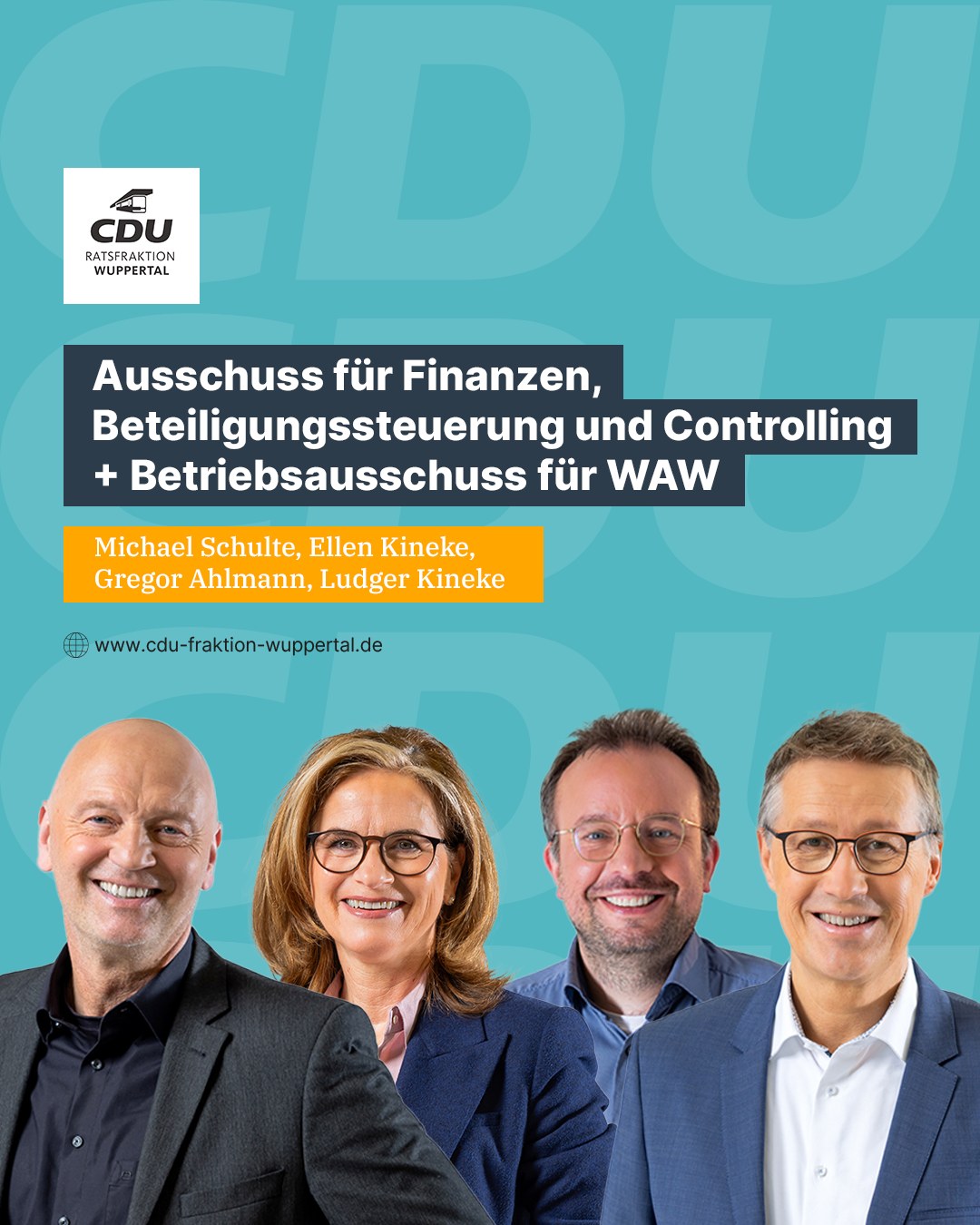 mehrUnsere Mitglieder im Ausschuss für Finanzen, Beteiligungssteuerung und Controlling + Betriebsausschuss für WAW: Michael Schulte, Ellen Kineke, Gregor Ahlmann & Ludger Kineke #cdu #cdufraktion #cdufraktionwuppertal #wuppertal #politik #partei #ratsfraktion #ausschuss